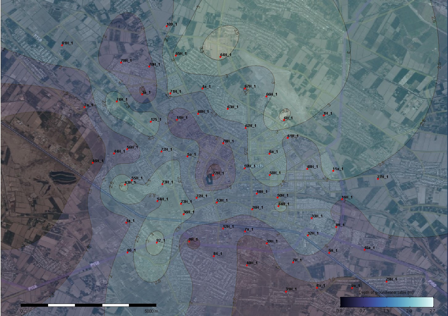 2D kaart van grondwaterstanden (m + referentieniveau) in Urgench.